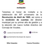Les invitamos a conmemorar el 60º aniversario de la Revolución de Abril de 1965 este jueves 24 de abril de 2025, a las 9:00 a.m., en el Ayuntamiento Municipal de Jayaco.