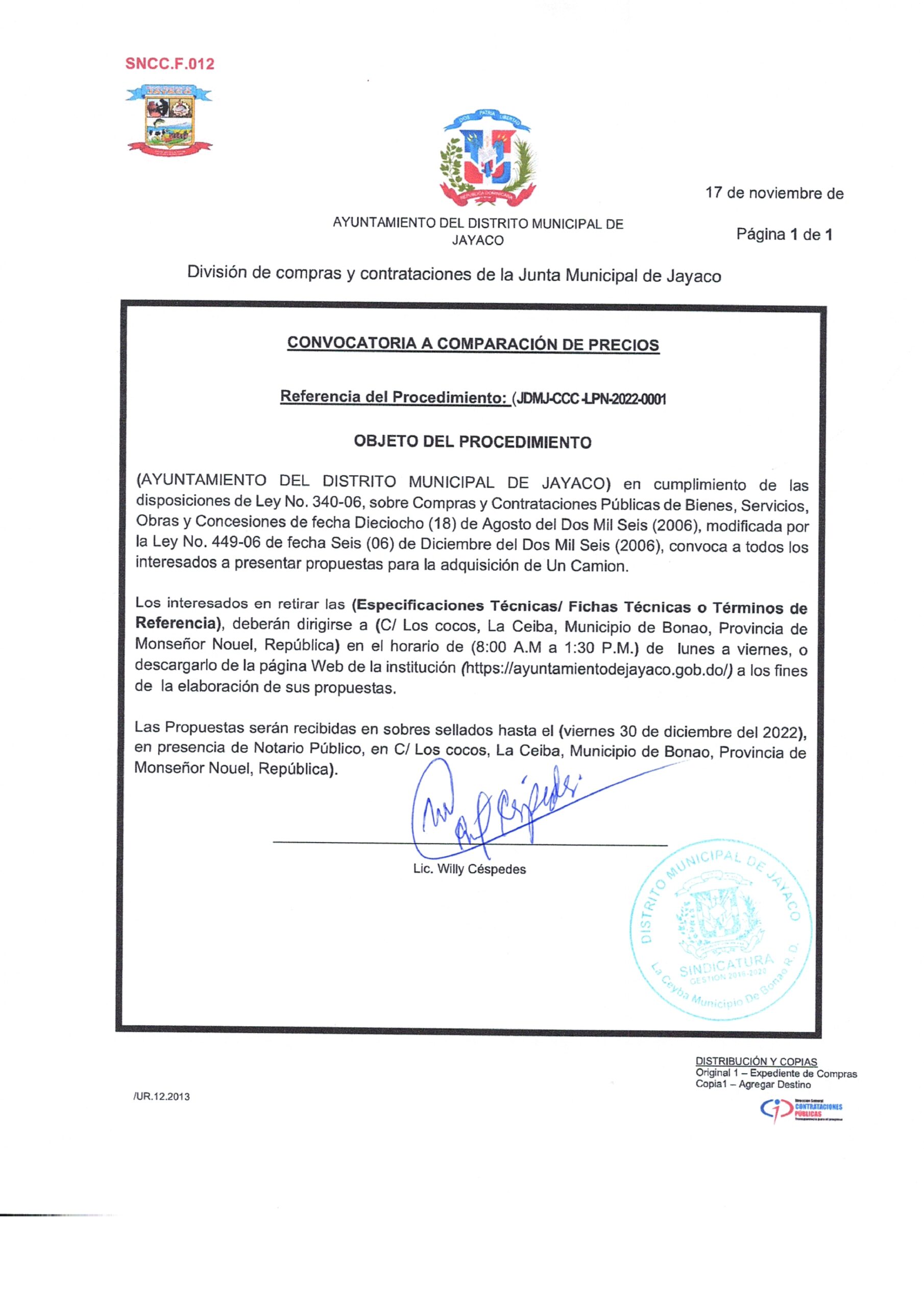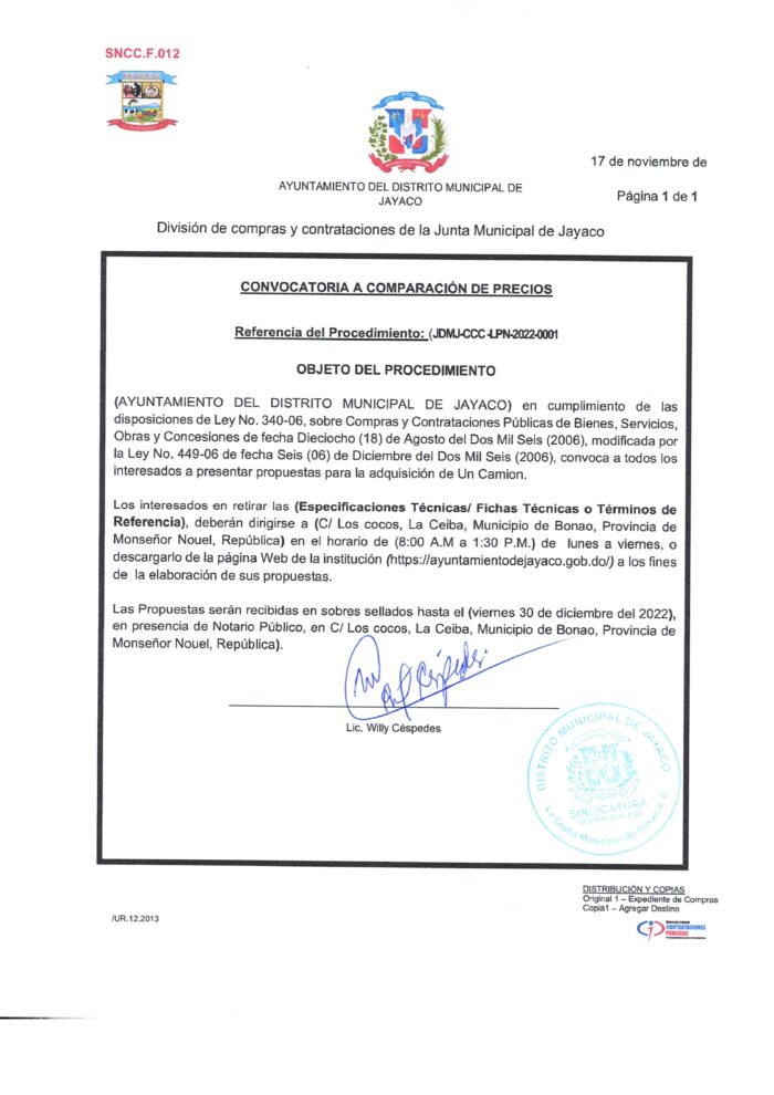 Nuestra Junta Municipal de Jayaco – La Ceiba hace la invitacion formal a todo los proveedores del estado que deseen participar en la Licitación Público Nacional por comparación de precio, para nuestra institución adquirir un camión para la recogida de desechos sólidos en este importante Distrito Municipal.