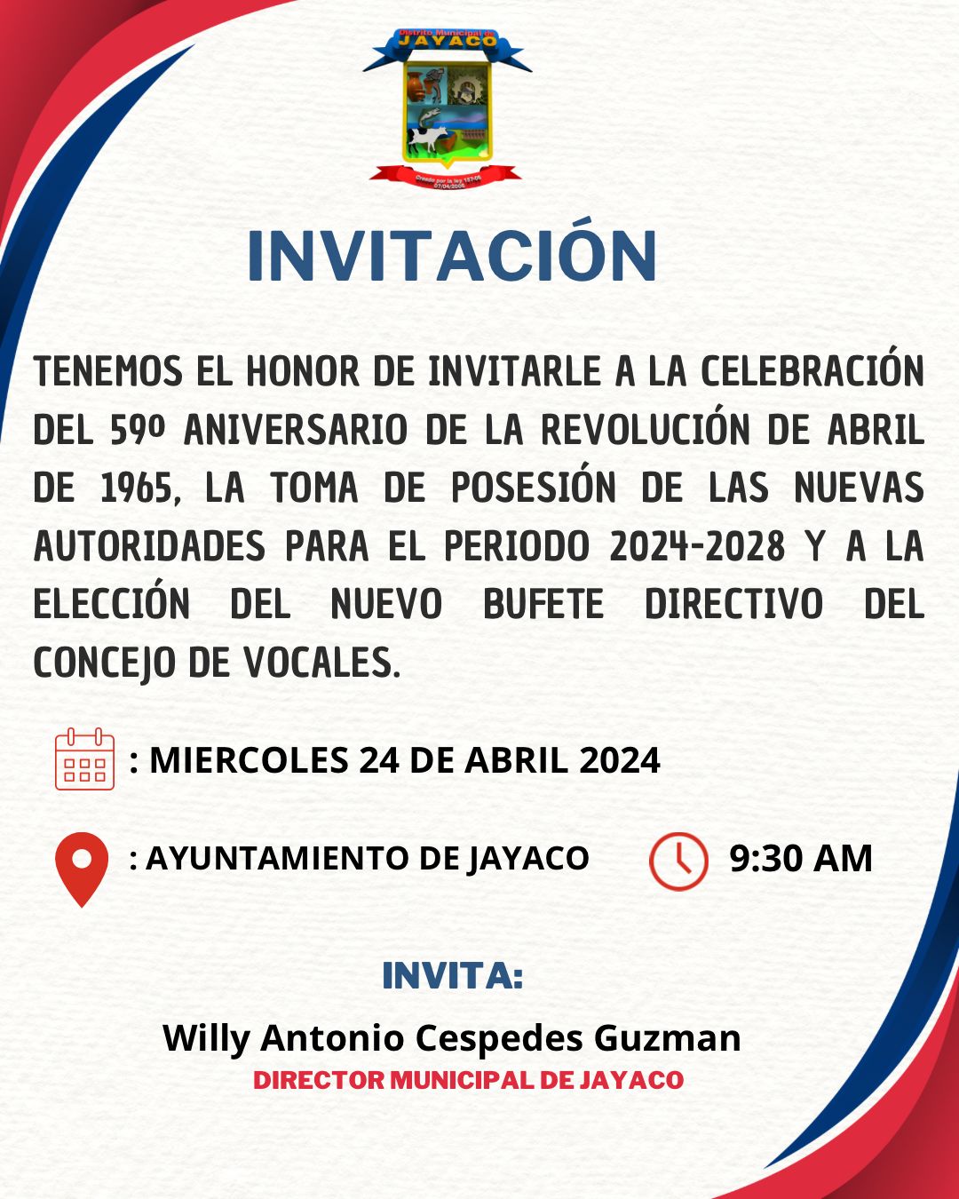 Buenas tardes de manera formal les invitamos a que acompañen a las nuevas autoridades electas de nuestro Distrito Municipal de Jayaco La Ceiba, para el período 2024-2028 , a su toma de posesión, mañana miércoles 24 de abril a partir de las 9 de la mañana en las instalaciones del Ayuntamiento Municipal de Jayaco, contamos con su presencia.