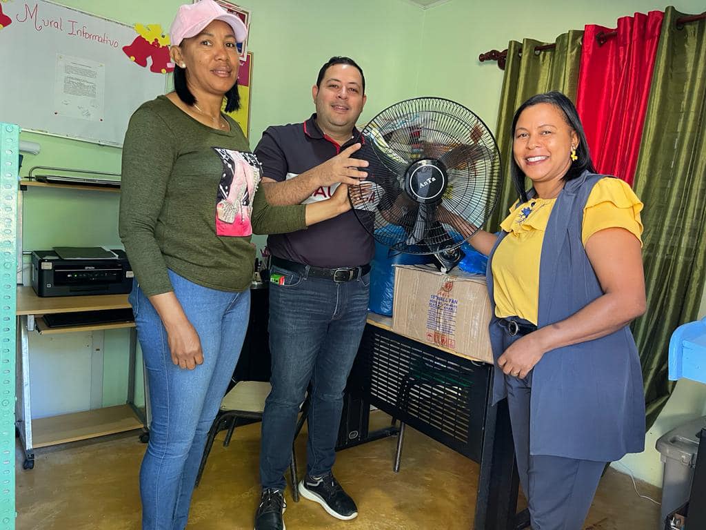 En la mañana del viernes 09 de Diciembre , el director municipal, Willy Céspedes, hizo entrega al Centro Educativo Justiniano Rodríguez del Cruce de la Ceiba, la donación de 5 abanicos para las aulas. Agradecemos a la directora, Sulaina Peña y Dalgy en representación de la junta de vecino de esta comunidad por acompañarnos.