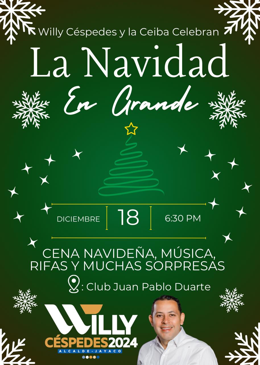 Hoy Lunes 18 de Diciembre a partir de las 6:30 de la tarde en la Club Juan Pablo Duarte de la Ceiba . *DONDE TENDREMOS CENA NAVIDEÑA , RIFAS Y MUCHAS SOLPRESAS MAS PARA TODOS LOS MUNICIPES DE LA CEIBA* Ya saben hoy desde las 6:30 de la tarde en el Club Juan Pablo Duarte de la Ceiba, ven celebremos la navidad Juntos . Mañana Martes 19 estaremos en la comunidad de Jayaco y el miércoles 20 en la Comunidad de Caño Piedra, feliz Navidad. #SeguimosTrabajando