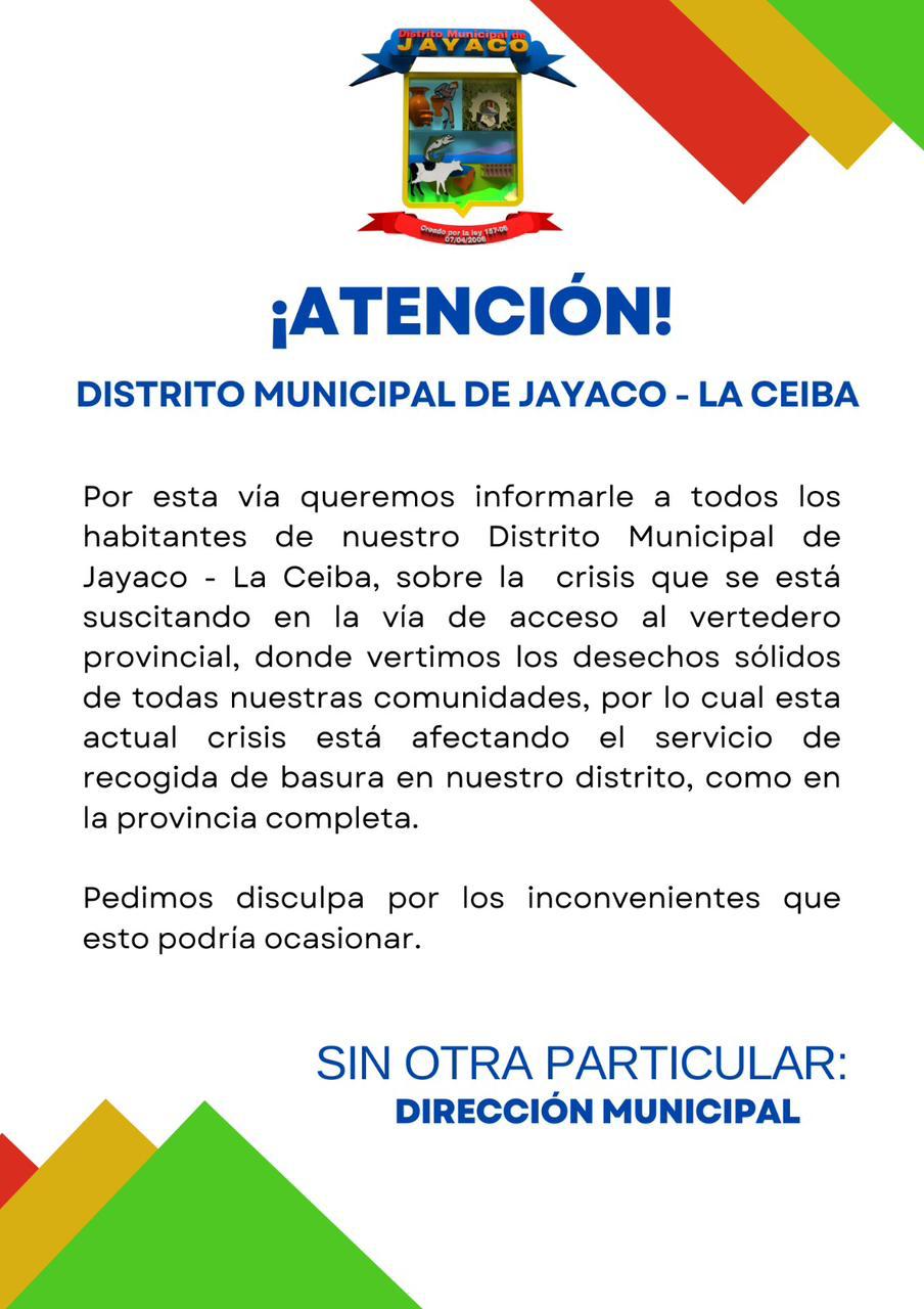 La Dirección Municipal Informa a lo Munícipes de este Distrito y al Publico en General Sobre la Situación con Relación al Vertedero.