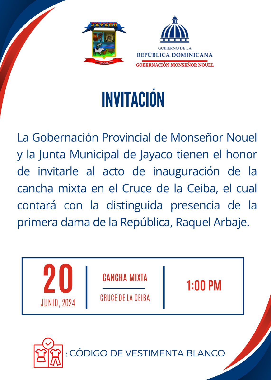 La Gobernación Provincial de Monseñor Nouel y la Junta Municipal de Jayaco, tienen el honor de invitarles al Acto de Inauguración de la Cancha Mixta de la Comunidad del Cruce la Ceiba . Dicho acto sera celebrado Mañana Jueves 20 de Junio a partir de la 1 de la tarde, contaremos con la Presencia de la Honorable Primera Dama de la República Raquel Arbaje.