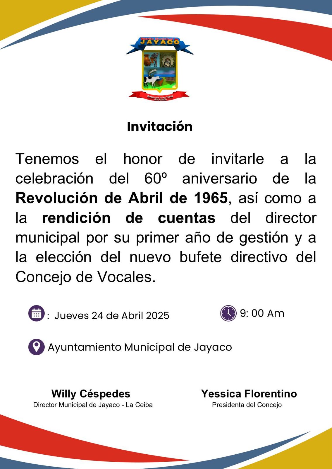 Les invitamos a conmemorar el 60º aniversario de la Revolución de Abril de 1965 este jueves 24 de abril de 2025, a las 9:00 a.m., en el Ayuntamiento Municipal de Jayaco. En el acto también se presentará la rendición de cuentas del Director Municipal, Willy Céspedes y se realizará la elección del nuevo bufete directivo del Concejo de Vocales. ¡Su presencia será muy importante!