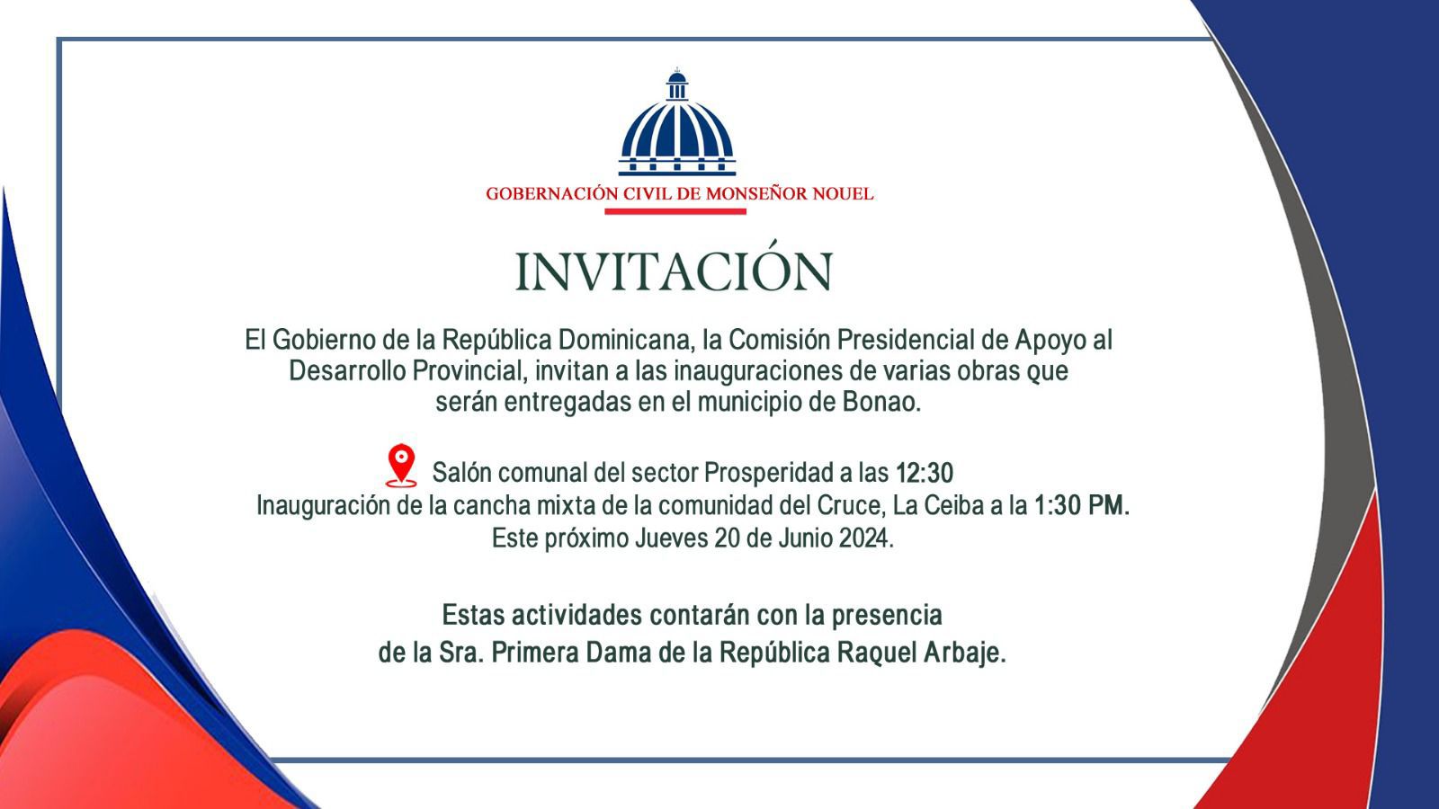 El Ayuntamiento de Jayaco Reitera la invitacion a todos los Municipes de Nuestro Ditrito a la Inauguración de la Cancha Mixta del Cruce de la Ceiba. este acto sera encabezado por la Primera Dama de la Republica Raquel Arbaje.